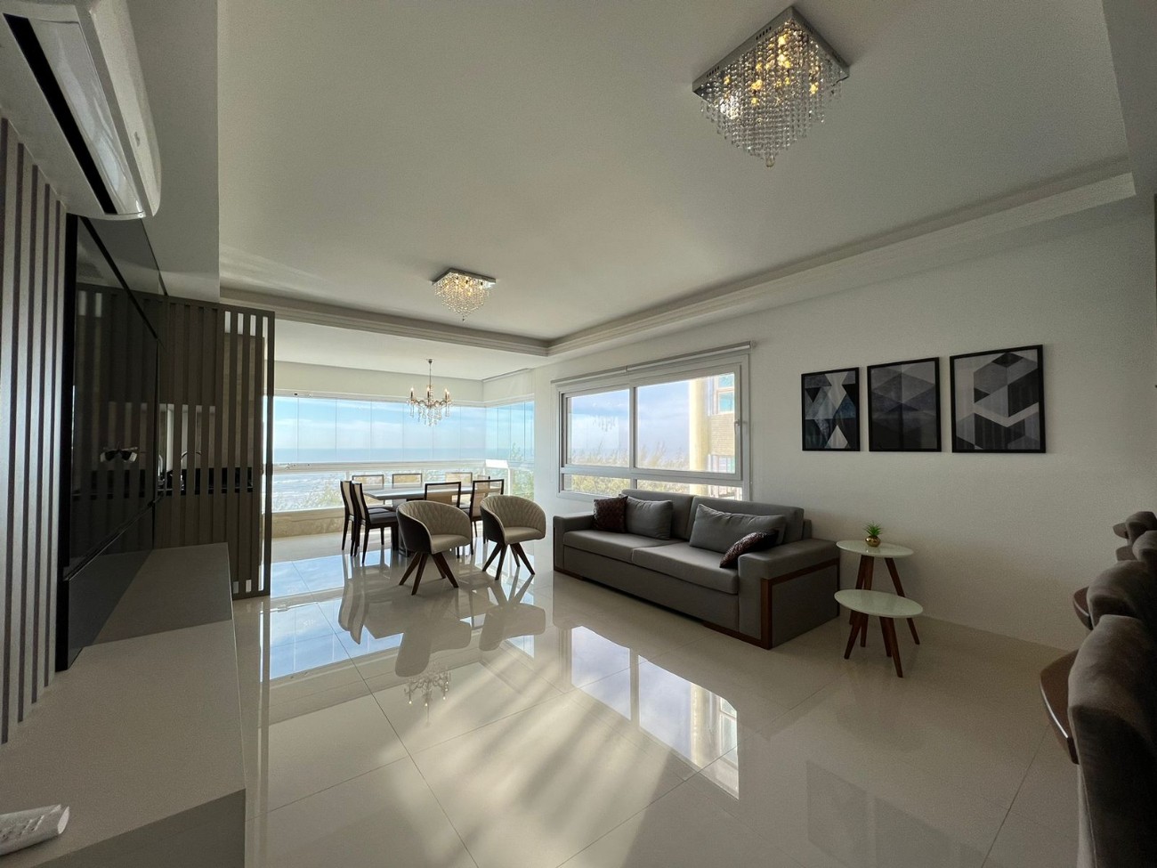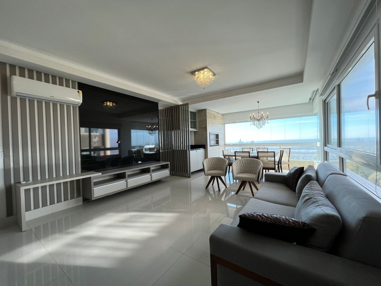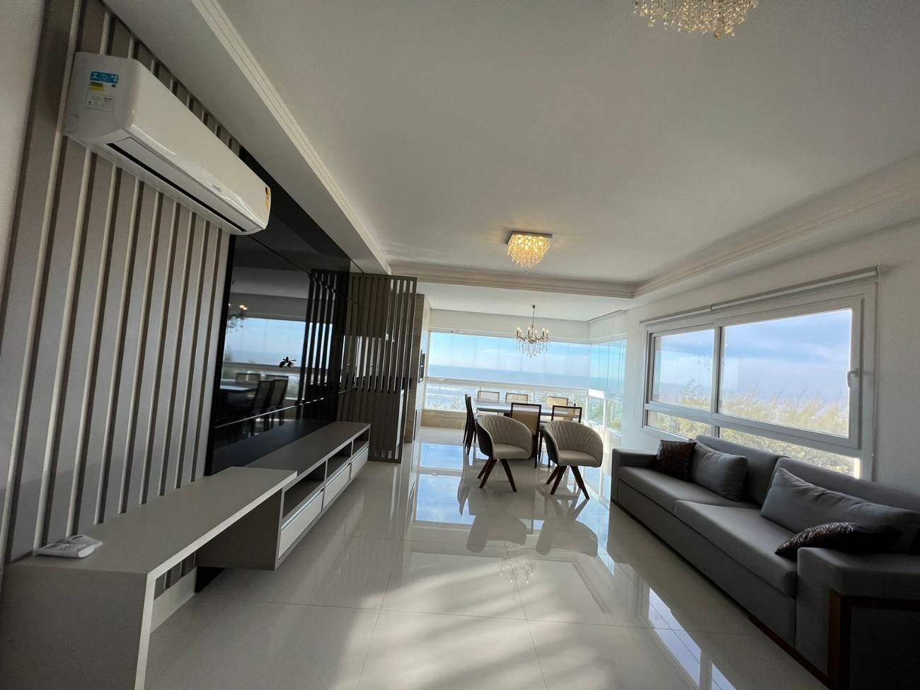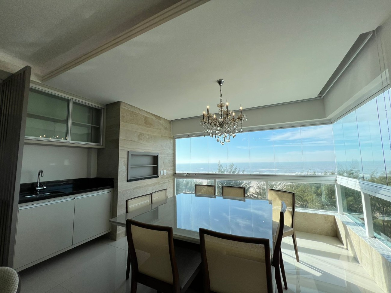 Amplo apartamento leste/sul composto por 3 dormitórios, sendo 2 suítes, banho social, lavabo, living para 3 ambientes, sacada frontal para o mar com vista cinematográfica, churrasqueira, cozinha americana, área de serviço, rebaixo em gesso, box de estacionamento. Edifício de luxo, com hall de entrada decorado, 2 elevadores digitais, portão e porteiro eletrônico, zeladoria permanente.