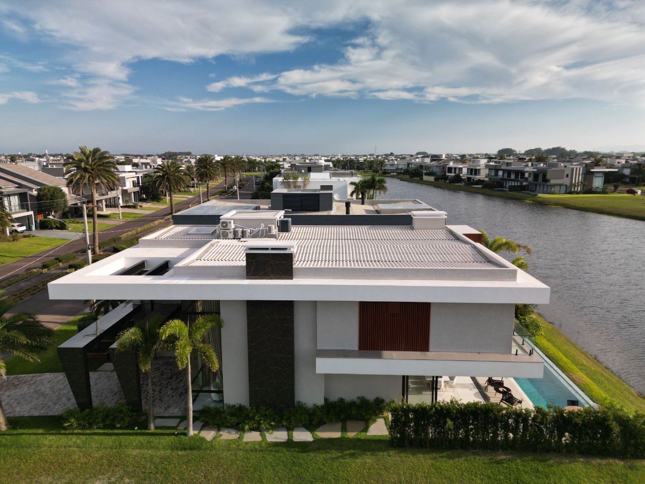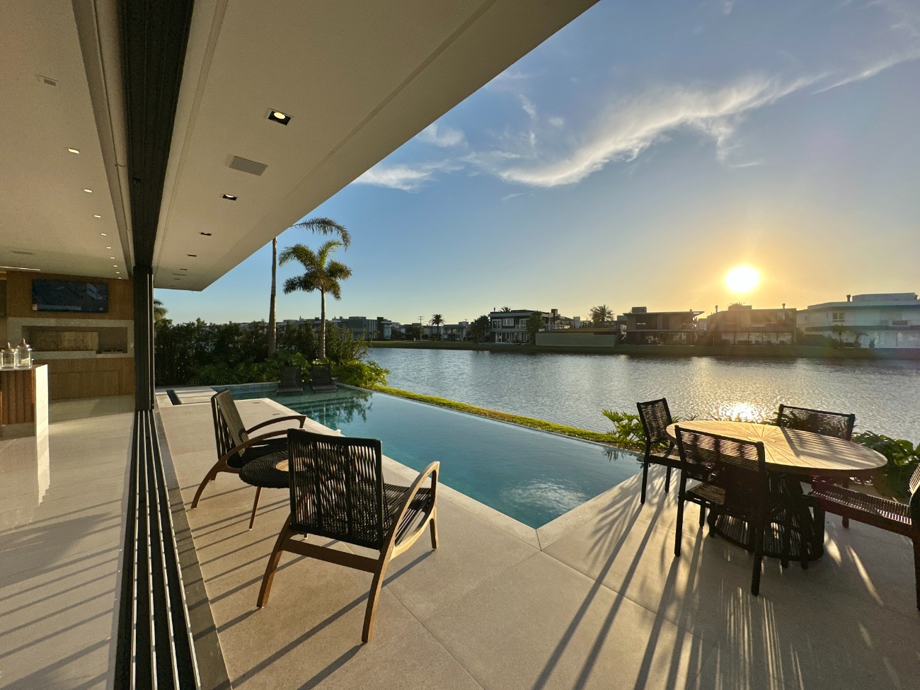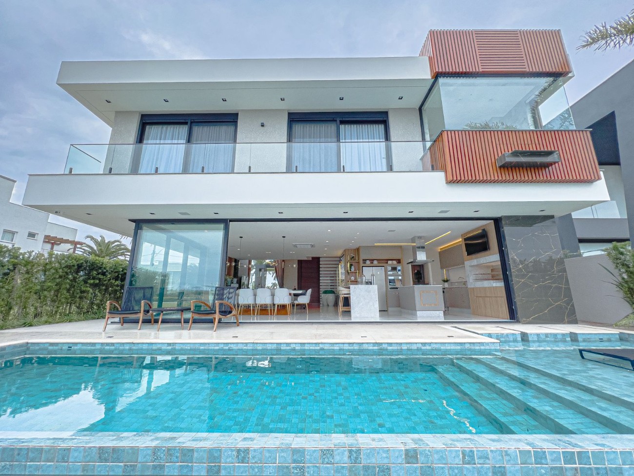 Esta deslumbrante residência de alto padrão, com 426m², apresenta um design que harmoniza luxo e funcionalidade em cada detalhe. Com cinco suítes, incluindo uma master térrea para máxima comodidade, este lar oferece um refúgio de elegância e conforto. A sala de jantar e sala de estar proporcionam espaços generosos para receber amigos e familiares, enquanto o cinema oferece entretenimento de primeira classe. O gourmet integrado à área de lazer é perfeito para momentos de convívio, complementado pela piscina de concreto com borda infinita e cascata, criando um ambiente de relaxamento exclusivo. Além disso, com um jardim com irrigação automatizada e espera para sistema fotovoltaico, esta residência é uma verdadeira expressão de sofisticação e sustentabilidade. Com uma localização privilegiada e sendo vendida completamente mobiliada e decorada, esta é uma oportunidade única de adquirir um imóvel que excede todas as expectativas de luxo e conforto. Agende sua visita e apaixone-se por esta obra-prima arquitetônica.