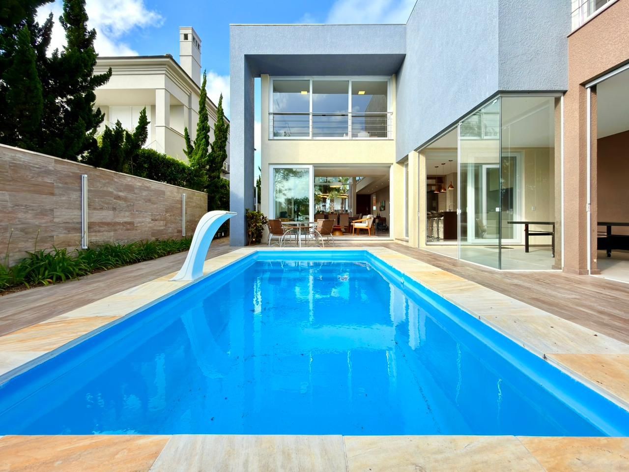 Apresentamos um sobrado impecável, finamente mobiliado e decorado, construído sobre um terreno de 480m², com 300m² de área privativa e frente Norte. A residência oferece uma experiência sofisticada desde a entrada: são quatro suítes, incluindo uma suíte térrea e uma suíte master com closet e uma ampla área de leitura, perfeitas para proporcionar aconchego e privacidade. O living em dois ambientes com lareira integra charme e funcionalidade, enquanto o pé-direito duplo traz imponência e luminosidade ao espaço. No mezanino, uma sala íntima acolhedora torna o ambiente ainda mais especial. A cozinha se conecta harmoniosamente à área de churrasco com ilha gourmet, criando um espaço ideal para receber familiares e amigos. A ampla varanda fechada em vidro oferece vista direta para a piscina aquecida, proporcionando um ambiente convidativo para relaxar em qualquer época do ano. Nos fundos, o pátio verde garante sombra, tranquilidade e total privacidade junto ao muro, tornando o quintal um verdadeiro refúgio. O imóvel conta ainda com lavanderia, depósito, banheiro de apoio à piscina e abrigo coberto para dois carros. Um sobrado moderno, elegante, completo e pronto para morar. Perfeito para quem busca qualidade de vida, conforto e exclusividade em cada detalhe.